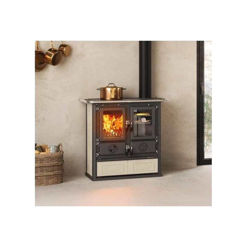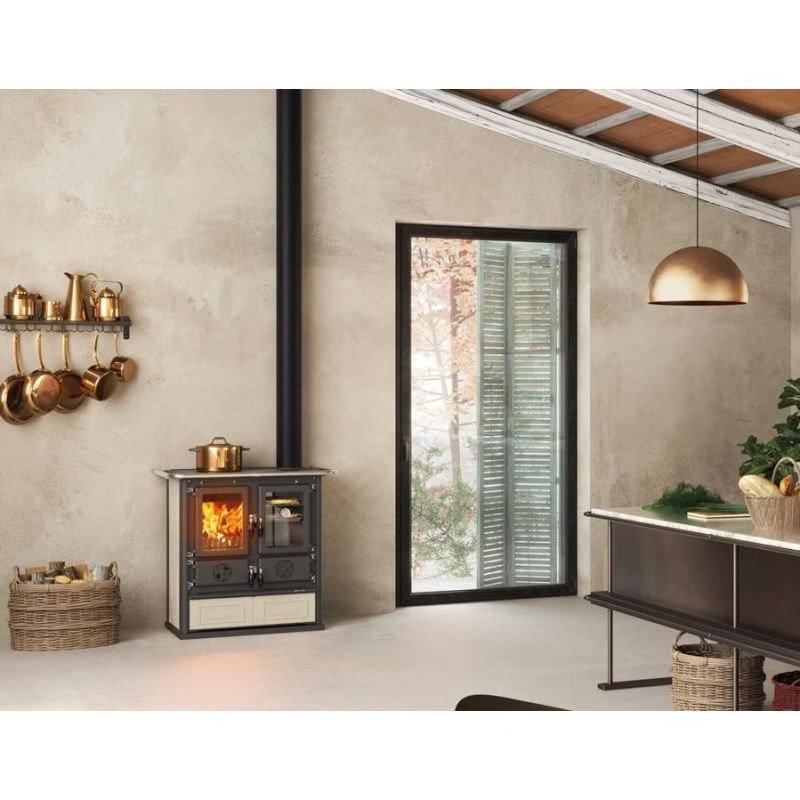 Il forno smaltato da 28 L consente di preparare piatti gustosi sfruttando il calore della legna, mentre la struttura in ghisa e il rivestimento esterno in maiolica decorata garantiscono solidità, durata e un’ottima capacità di accumulo termico.