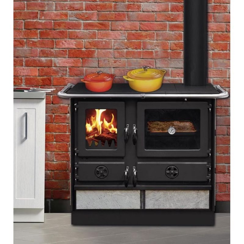 Il modello è dotato di piastra e cerchi in ghisa, griglia del focolare in ghisa, focolare in thermo-béton, termometro e regolazione dell’aria primaria e secondaria, che assicurano un controllo preciso della combustione e il massimo rendimento. Il cassetto porta-legna facilita lo stoccaggio, mentre la teglia forno inclusa consente di cucinare in modo pratico e versatile.