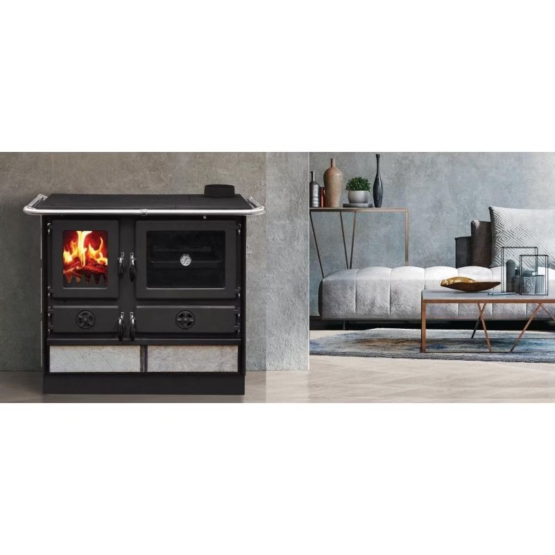 La stufa è adattabile a qualsiasi ambiente grazie alla doppia uscita fumi (posteriore o superiore), combinando riscaldamento, funzionalità culinaria e robustezza in un unico apparecchio affidabile e duraturo.